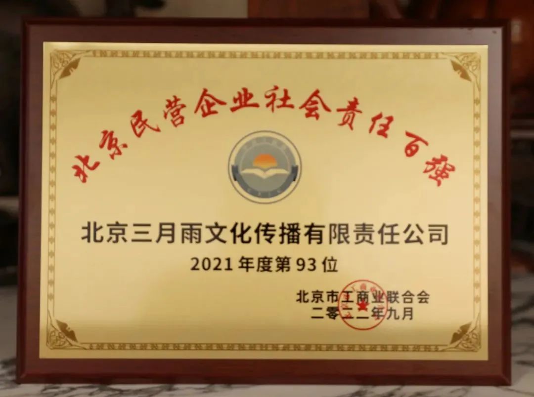 2022年9月,三月雨入选北京民营企业社会责任百强第93位。未来,三月雨将继续以实际行动履行社会责任,彰显企业担当。