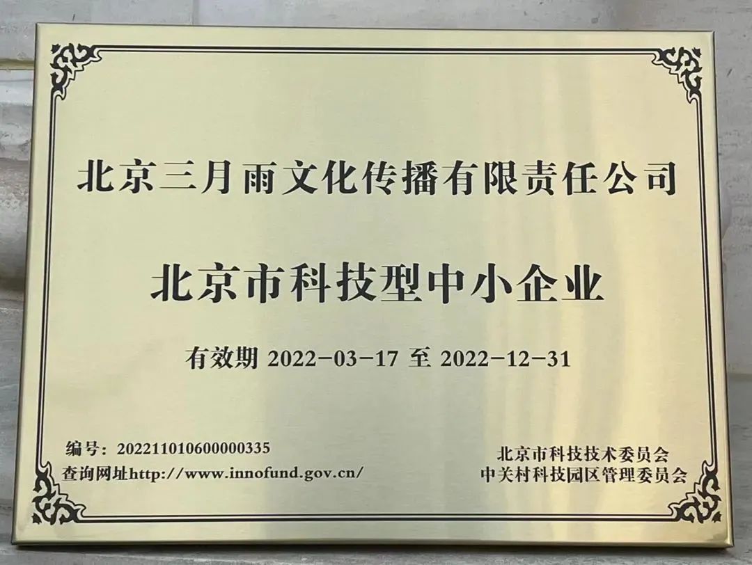 3月17日,经北京市科技技术委员会、中关村科技园区管理委员会审批,三月雨获评“北京市科技型中小企业”,本次入选标志着三月雨的科技研发及成果得到了官方的认可。