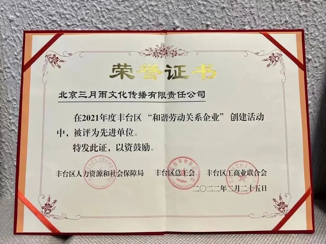 2月25日,三月雨入选2021年度丰台区“和谐劳动关系企业”先进单位,未来,三月雨将进一步在员工内部服务及人才培养等相关工作方面进行优化,以创新与实效领航同行。