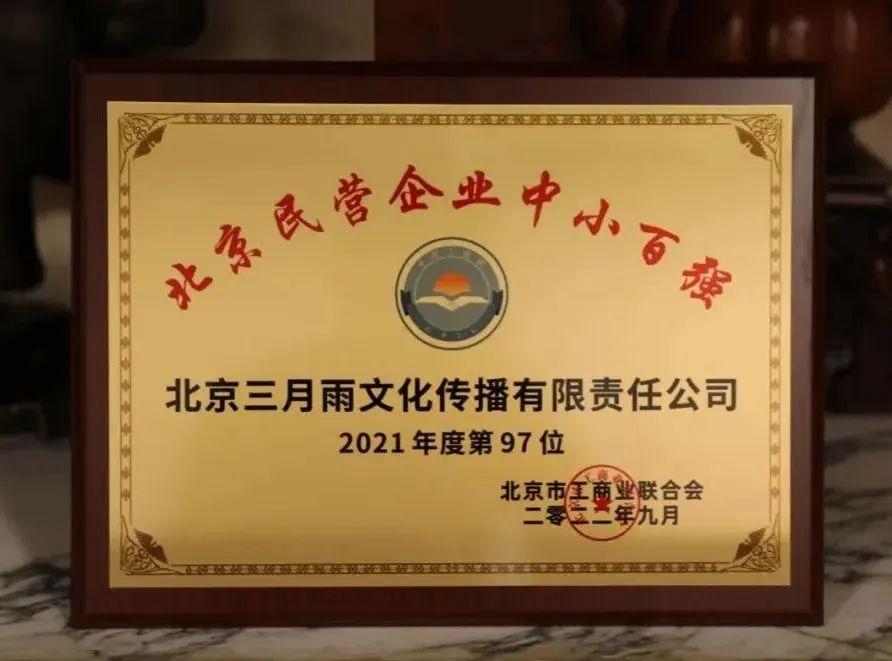 2022年9月,三月雨荣登“北京民营企业文化产业百强”第74位。三月雨将持续创新,为首都经济发展注入更多活力。